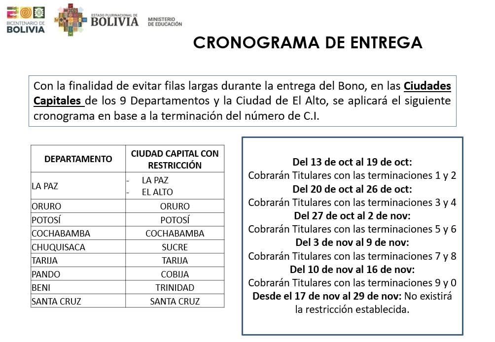 “Con la finalidad de evitar filas largas durante la entrega del bono, en las ciudades capitales de los nueve departamentos y la ciudad de El Alto, se aplicará el cronograma en base a la terminación del número de carnet de identidad”, refiere el cronograma del Ministerio de Educación.