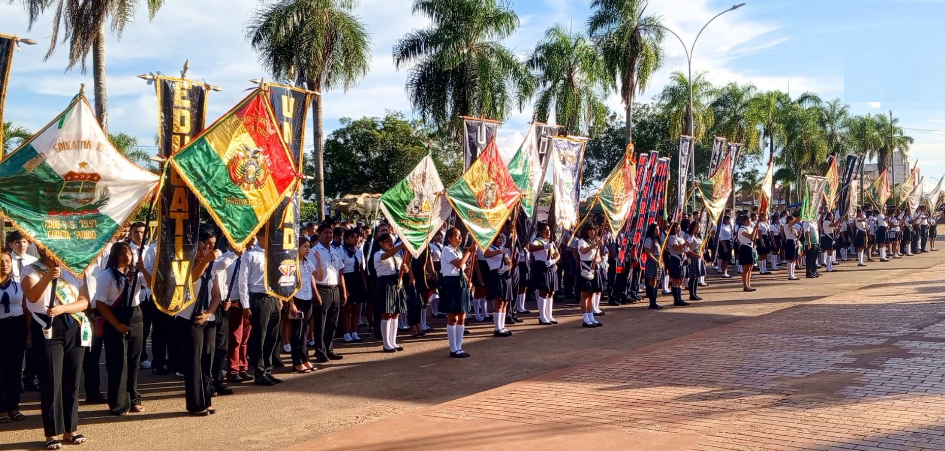 En la Plaza Principal se realizó la Iza de Pabellón y Ofrenda Floral, con la participación de autoridades civiles, militares y policiales; mientras el Parque Urbano fue escenario del Desfile Cívico Escolar-Institucional, que congregó a varias instituciones y decenas de estudiantes de secundaria y plantel docente de unidades educativas, para rendir homenaje a la antigua Puerto Bahía, hoy la ciudad de Cobija.