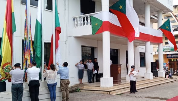 COBIJA/PERLA DEL ACRE.- En el mes aniversario de Cobija (9 de febrero), este lunes, autoridades y funcionarios de distintas instituciones, participaron en la iza del pabellón, como inicio a las actividades programadas en homenaje a los 120 años de fundación de la antigua Puerto Bahía, hoy la ciudad de Cobija.