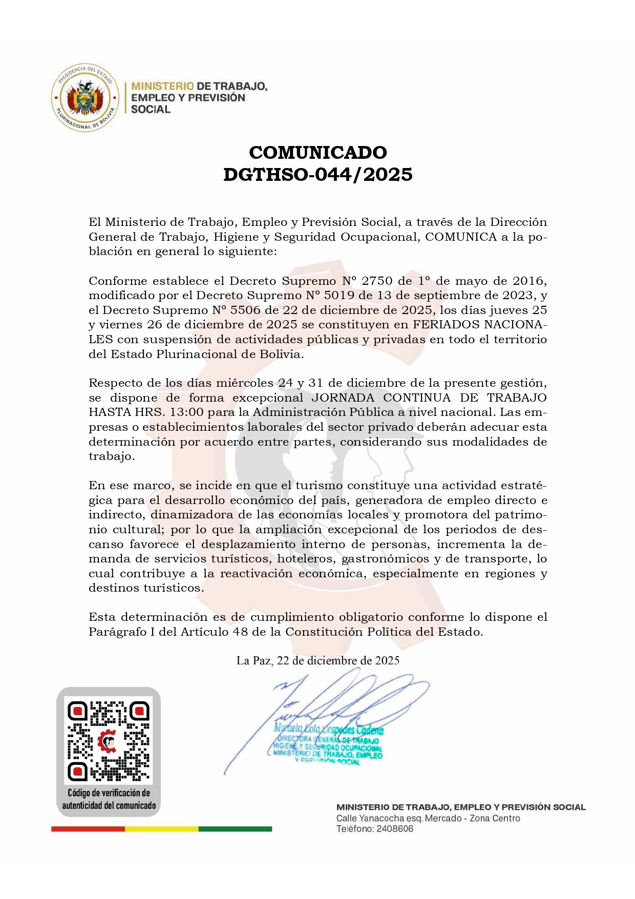 LA PAZ/RE-AGENCIAS.- El Gobierno declaró feriados nacionales los días jueves 25 y viernes 26 de diciembre de 2025, con suspensión de actividades públicas y privadas en todo el territorio del Estado Plurinacional de Bolivia.