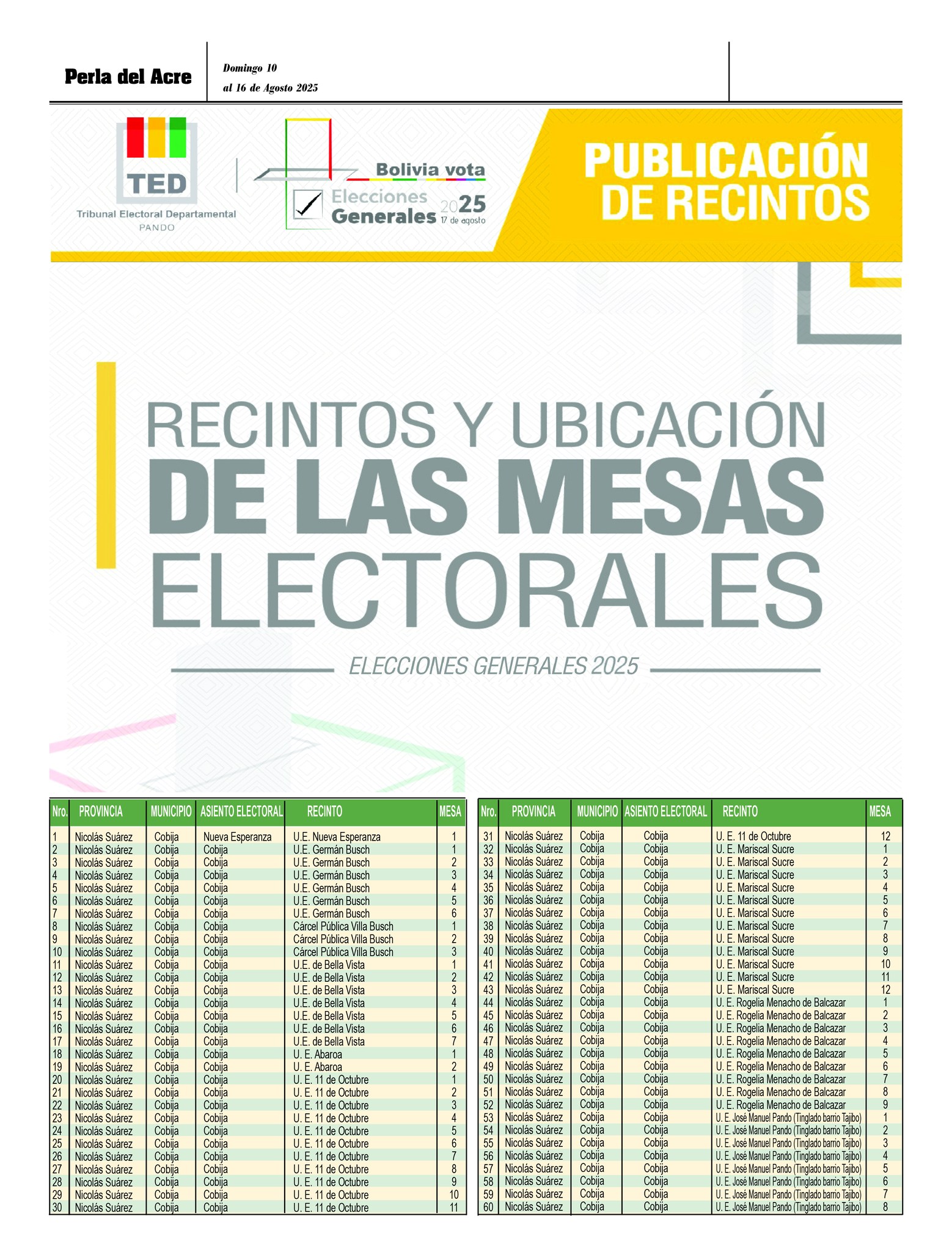 En el departamento de Pando esta publicación se realiza en medio de impreso, en páginas digitales y redes sociales, también en el sitio web del Tribunal Electoral Departamental de Pando (pando.oep.org.bo)